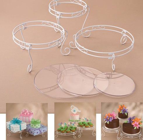 Eleganter 3-teiliger Ständer von Wilton für Hochzeitstorten, aber auch andere kreative Torten. Aus weiß lackiertem Metall. Die Ablagen sind aus kristallklarem, durchsichtigen Kunststoff. Abmessungen; 20, 25 und 30 cm.
