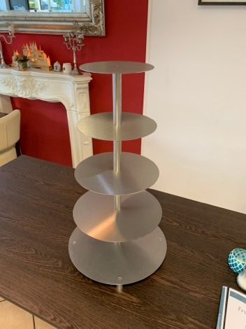 5er Edelstahl-Etagere, Gesamthöhe 70cm, die Edelstahlscheiben haben einen Durchmesser von 20, 24, 28, 32 und 38cm. Wahlweise kann man die untere Scheibe gegen eine 48cm Scheibe tauschen.