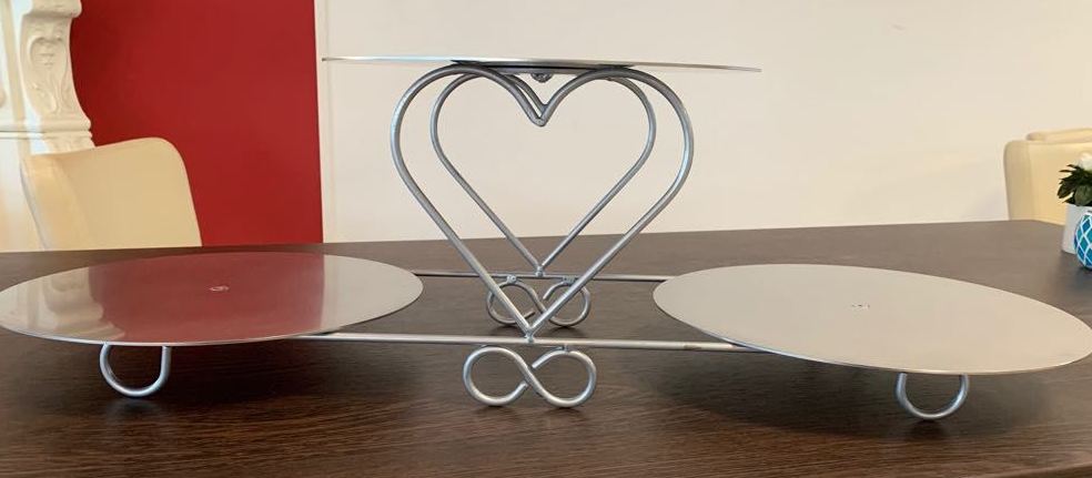 Metallherztortenständer für schwere Kuchen mit Edelstahlscheiben in den Durchmessern 26cm oder 31cm, bitte geben Sie die Größen in Ihrer Bestellung mit an. Gesamtlänge ca 70cm.