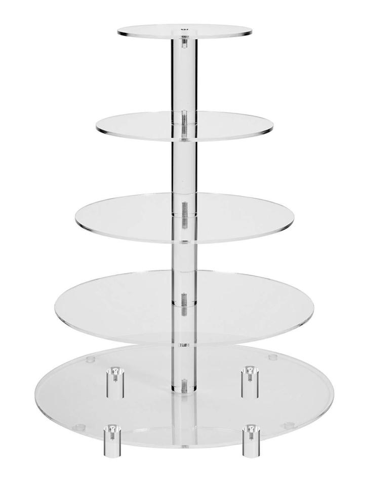 Acryl-Etagere, Gesamthöhe 45cm. Die Durchmesser dieser Etagere sind 15, 19, 22, 26 und 30cm.