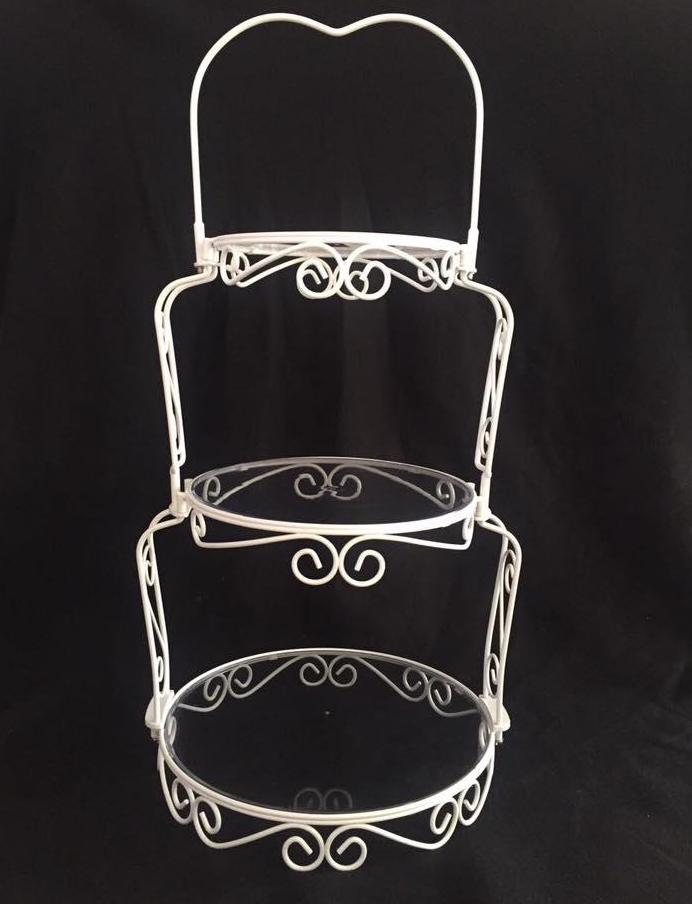 Eleganter 3-teiliger Ständer von Wilton für Hochzeitstorten, aber auch andere kreative Torten. Aus weiß lackiertem Metall. Die Ablagen sind aus kristallklarem, durchsichtigen Kunststoff. Abmessungen; 20, 25 und 30 cm.